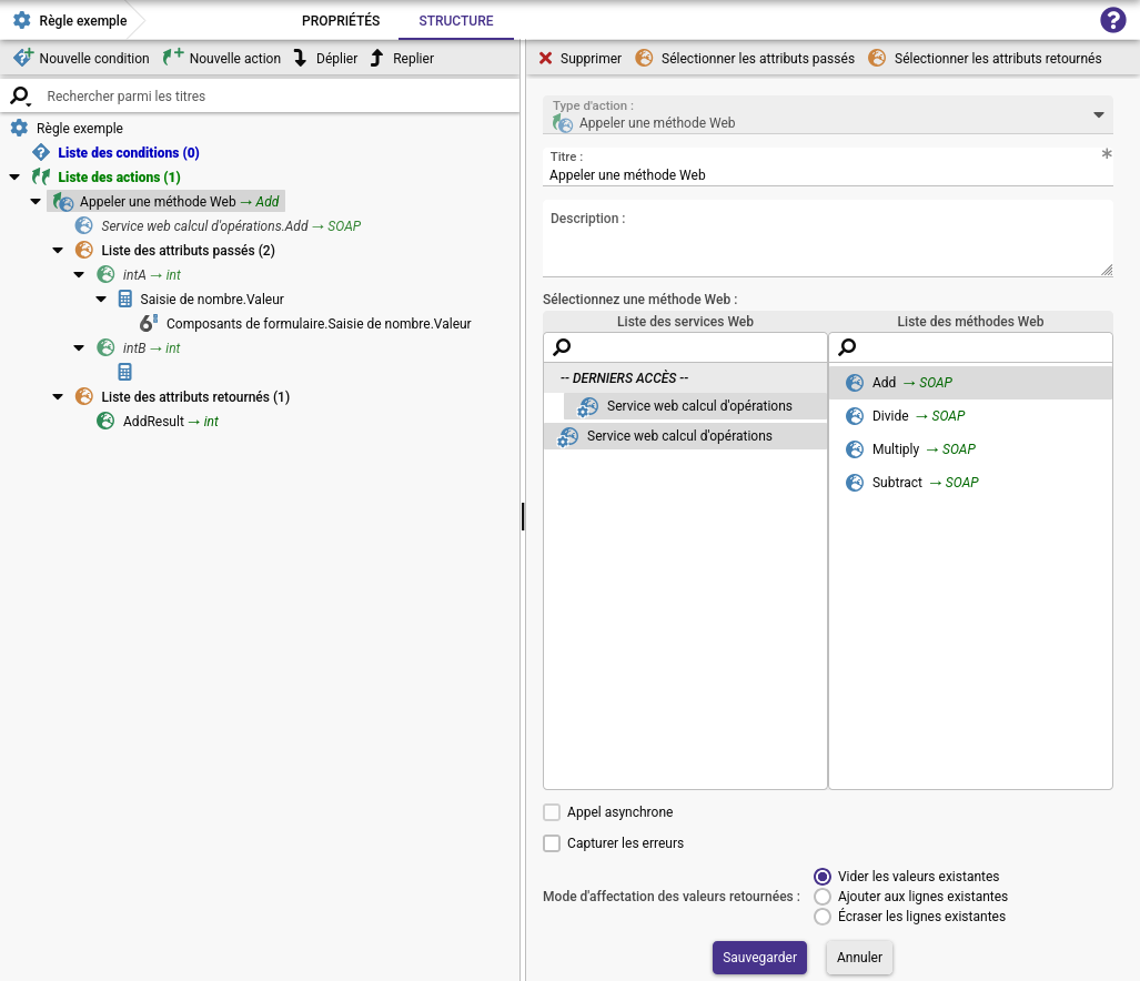 Le premier attribut de la méthode web est lié au contrôle de saisie de la première opérande, le second attribut est lié au contrôle de la seconde. L’attribut retourné est lié à l’étiquette Résultat obtenu. Cliquer sur Sélectionner les attributs retournés pour pouvoir affecter le résultat de l’opération.