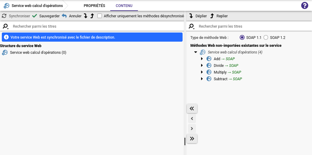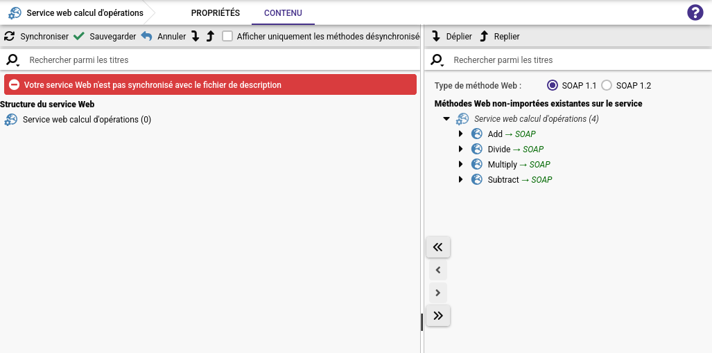 Cliquer sur Sélectionner un fichier pour charger le fichier xml, yaml, yml, json, wsdl, ou xsd. Une fois fait, l'onglet Contenu s'affiche. Si le message Votre service web n'est pas synchronisé avec le fichier de description s'affiche, cliquer sur le bouton Synchroniser.